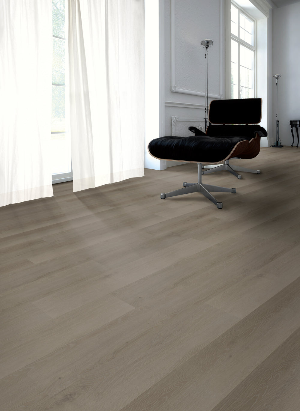 2.5 mm dik met 0.55 mm slijtlaag voor intensief huishoudelijk gebruik (klasse 33). Waterbestendig, vuilafstotend, krasvast en ftalaatvrij met A+ label en E1-norm voor lage VOC-uitstoot.