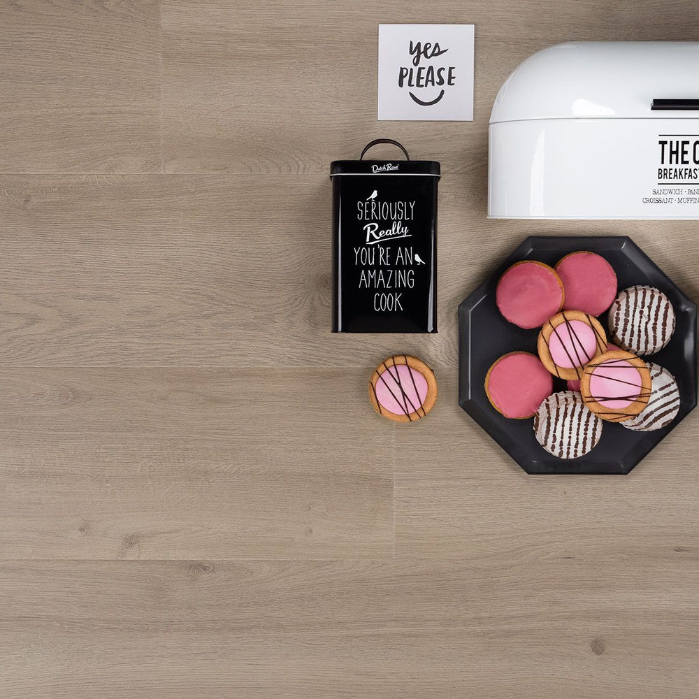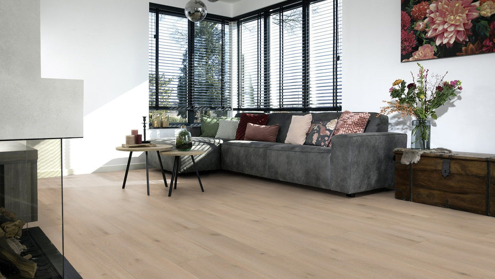 De warme grijze kerrie-tint met subtiele noesten en mat oppervlak creëert een minimalistisch, natuurlijk houtbeeld. De extra brede planken van 24,4 cm versterken het vloeiende, ruimtelijke effect.