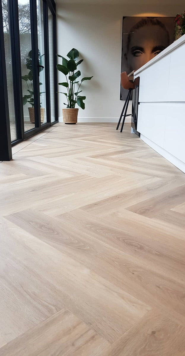 Floer Walvisgraat Click PVC Orka Onbehandeld – luxe XL visgraatvloer met licht eiken uitstraling