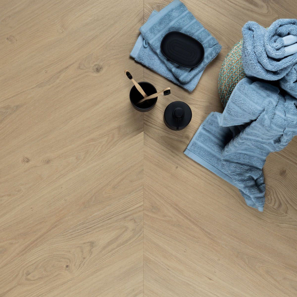 Een groot voordeel van deze PVC vloer is dat u hem op twee manieren kunt leggen: in de lengte of in de breedte. Welke legwijze het meest geschikt is, hangt af van de lichtinval in uw woning. Heeft u weinig natuurlijk licht? Dan is het aan te raden om de vloer in de breedte te leggen. Dit zorgt voor een optisch effect waardoor de ruimte groter en ruimer oogt. Daarnaast beschikt de Douwes Dekker Ambitieus Hongaarse Punt Panna Cotta over een 100% waterdichte bovenlaag. Hierdoor kan water niet in de vloer trekken, wat beschadigingen voorkomt. Dit maakt de vloer ideaal voor gebruik in de keuken, badkamer of het toilet.